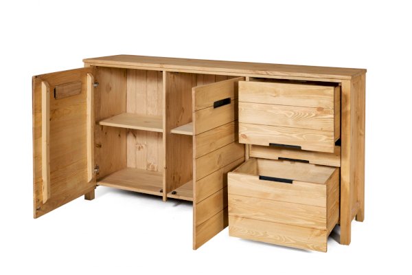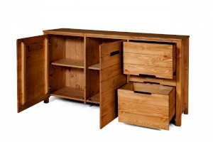 Две распашные дверки, между ними перегородка. За каждой дверкой по полке. 2 выдвижных ящика.